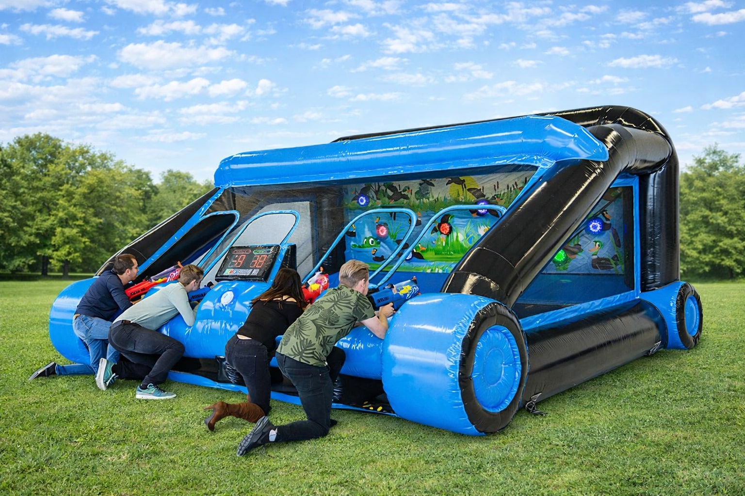 Ce sont des structures gonflables impressionnantes, professionnelles, combinées à un système interactif IPS (boutons lumineux à désactiver le plus rapidement possible), qui ajoutent rythme, compétition et adrénaline.
