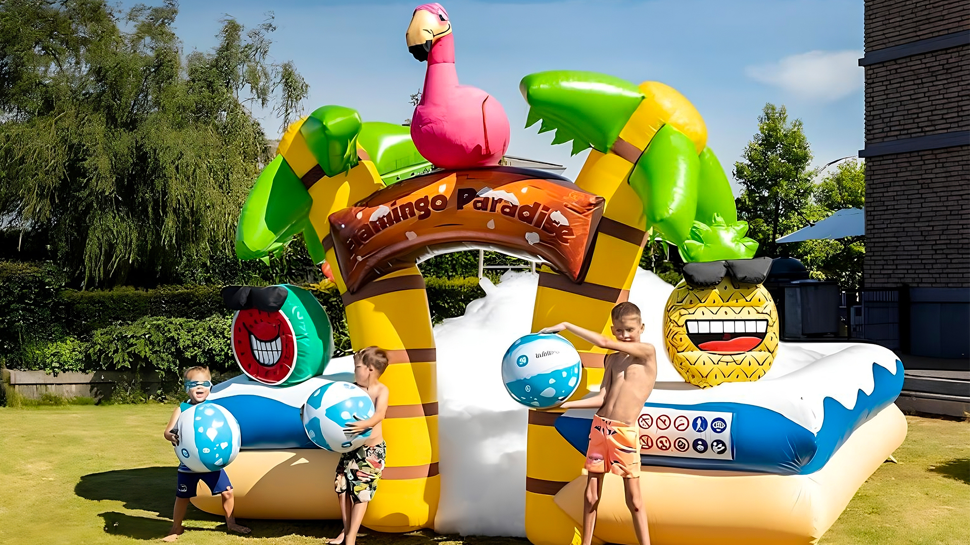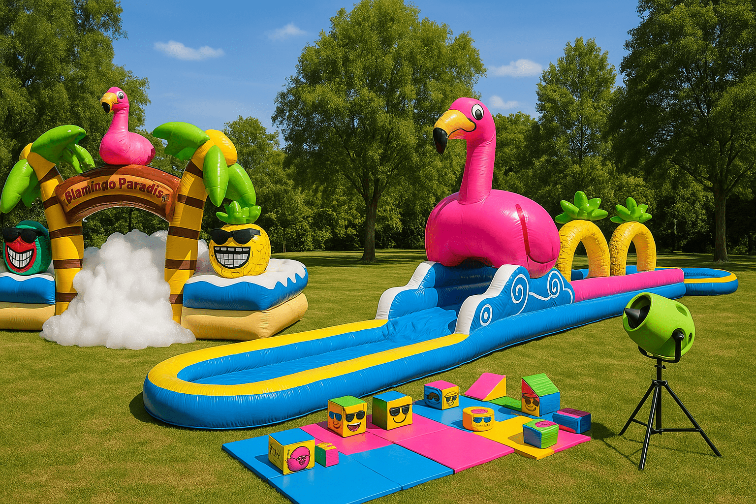 Apportez une vague de folie tropicale à votre événement avec notre Glissade sur le ventre Flamant rose ! Colorée, amusante et rafraîchissante, elle est parfaite pour animer un festival, une journée en camp de jour, une fête de quartier ou même une activité spéciale en camping. Pour encore plus de plaisir, on propulse de la mousse directement sur la glissade avec notre canon à mousse — de quoi faire le bonheur des enfants et créer une ambiance complètement éclatée ! Une animation estivale qui vole assurément la vedette !