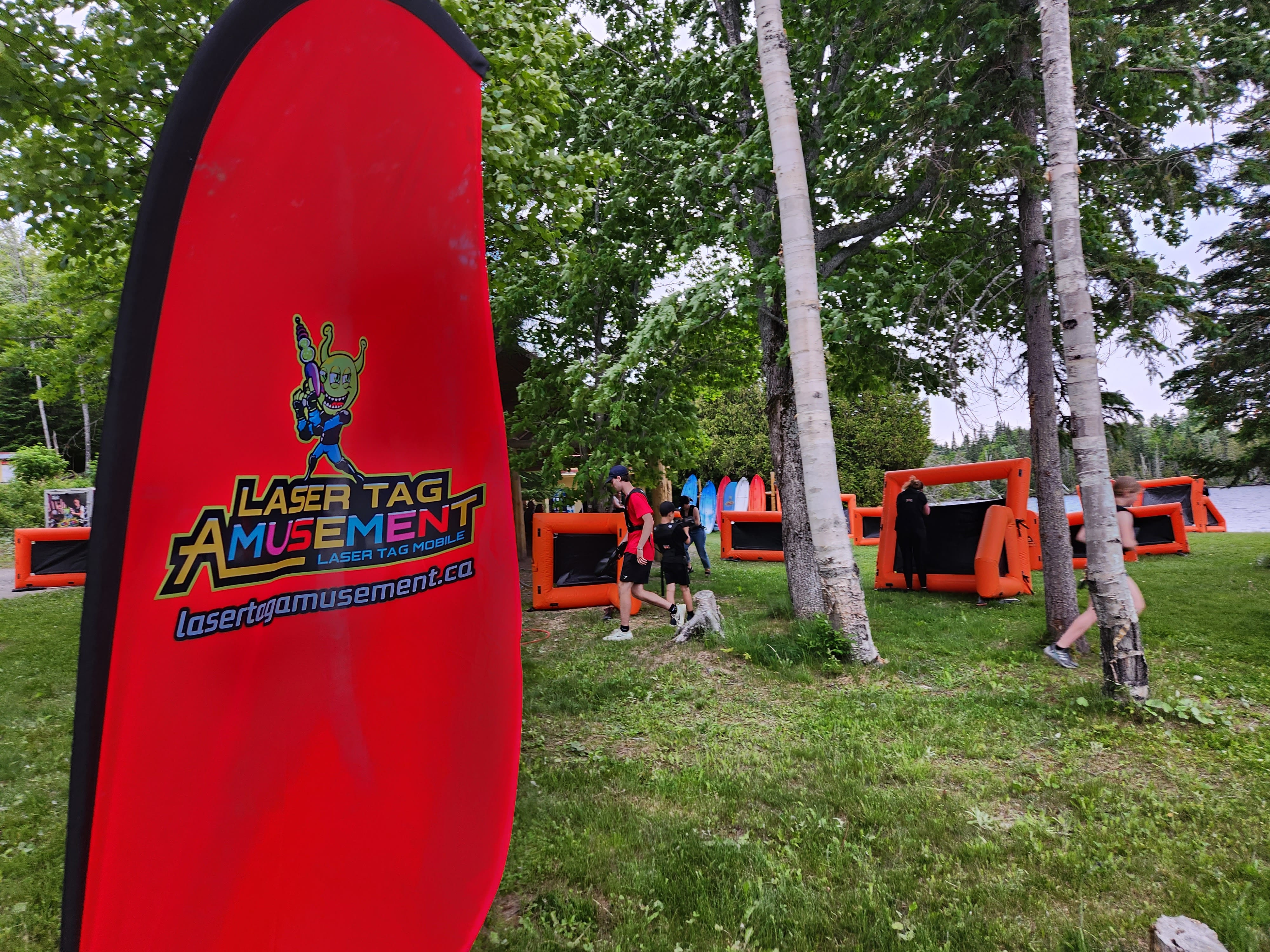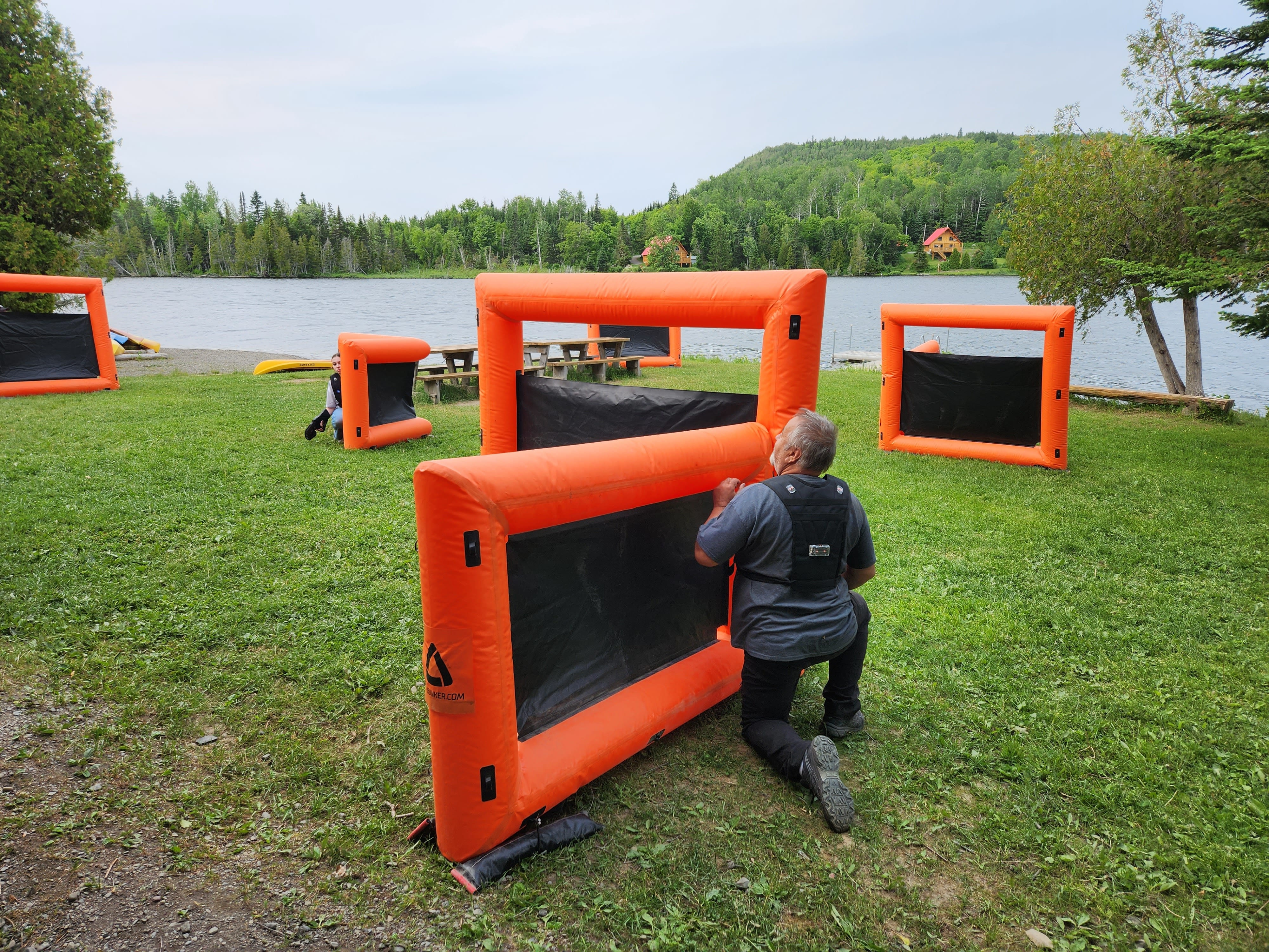L’installation du matériel prend environ 60 à 90 minutes, selon la taille de l’événement et le nombre de participants. L’installation inclut la mise en place des gilets, des fusils et des murs gonflables dans la zone de jeu.