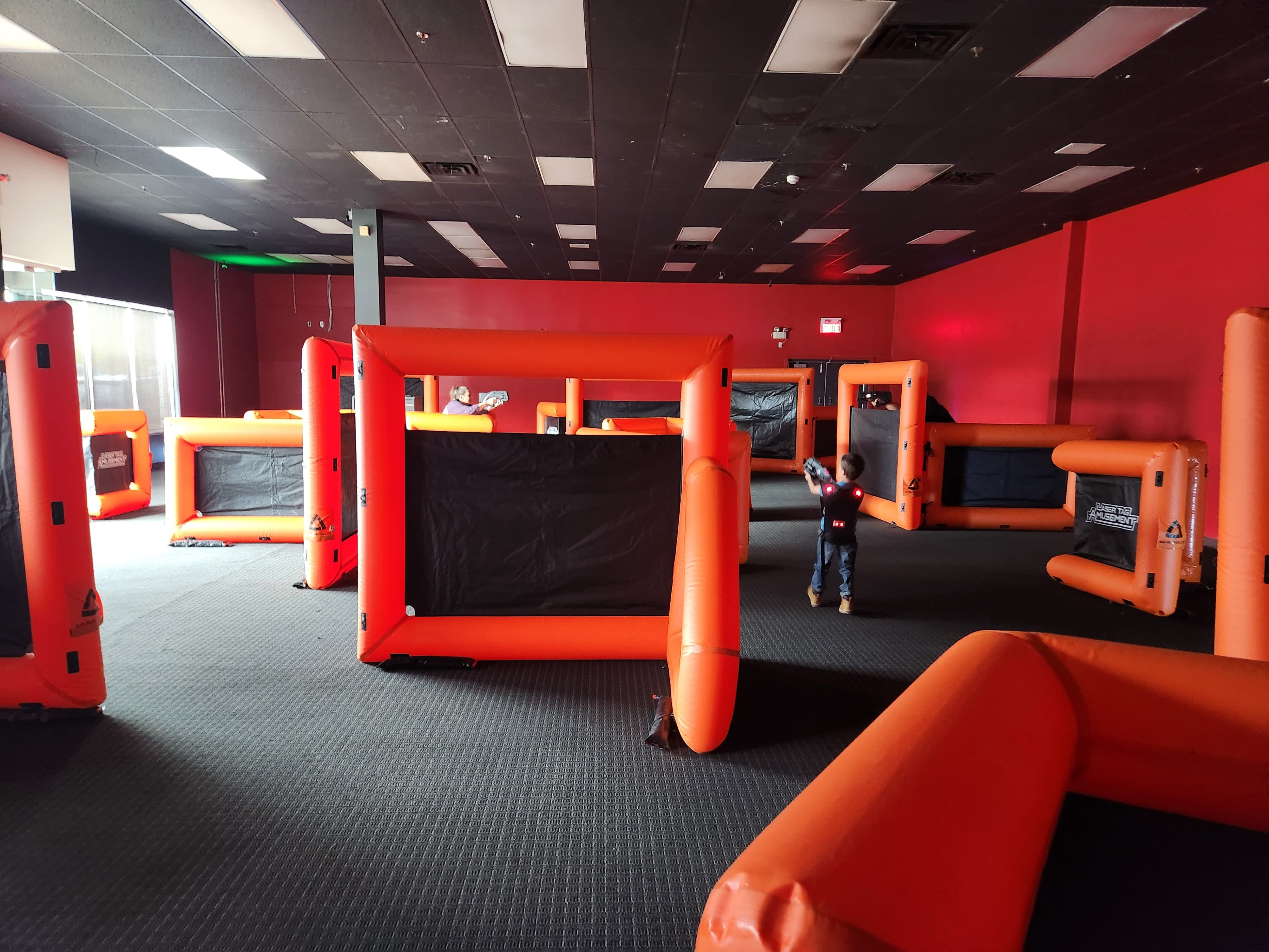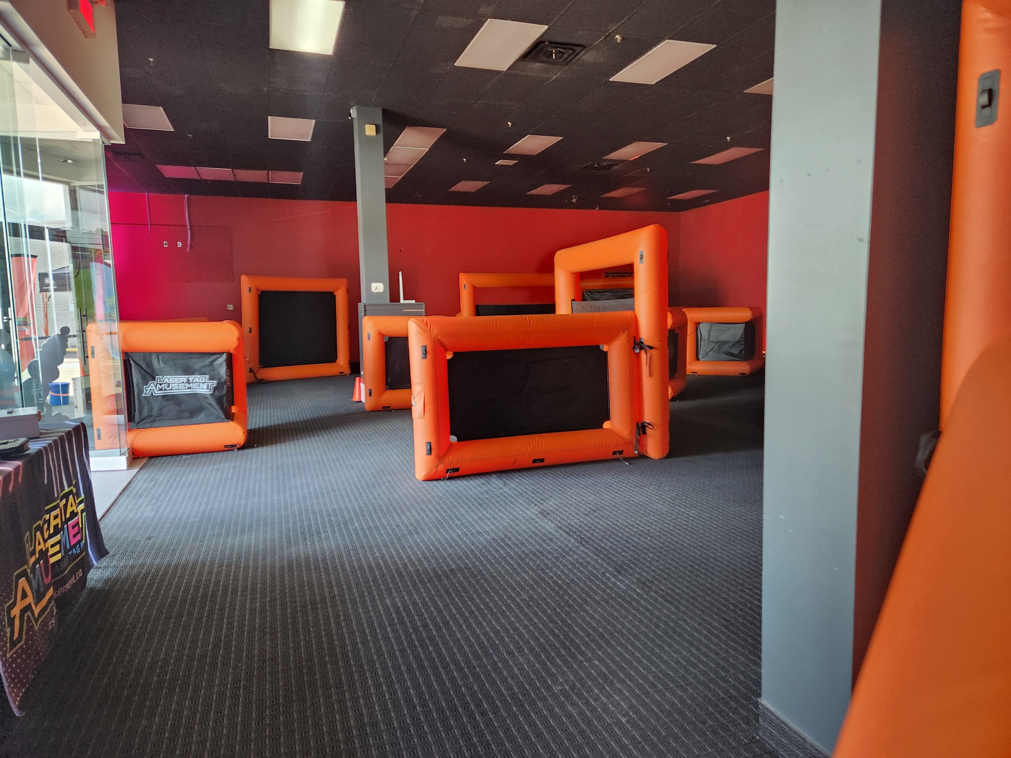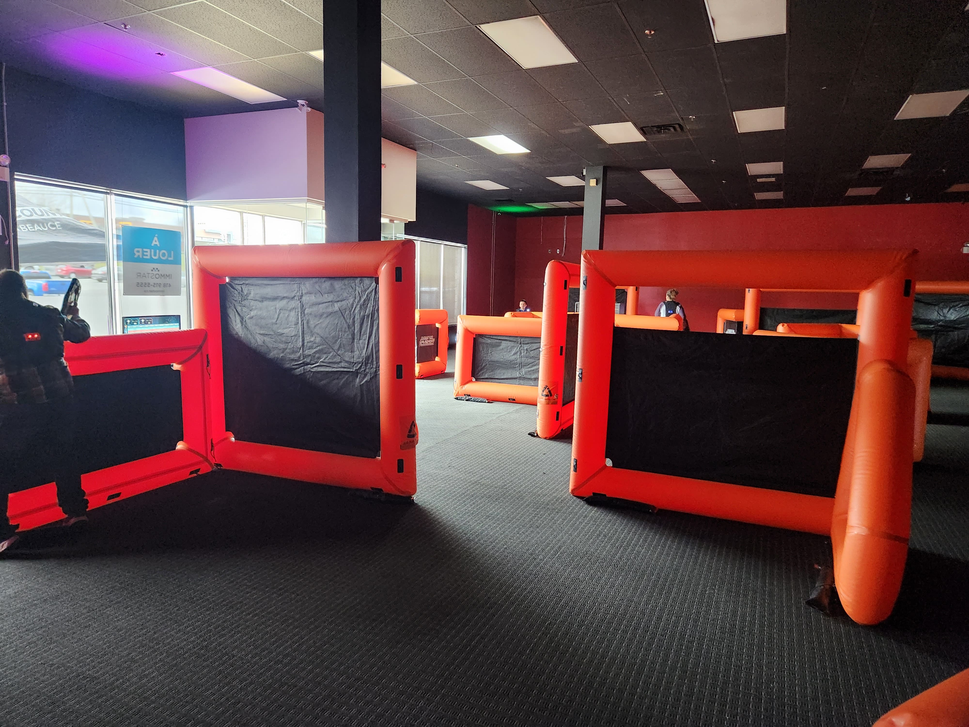 L’espace nécessaire dépend du nombre de joueurs. En général, un espace de 2500 pi² est suffisant, mais un espace plus grand est idéal pour une expérience plus immersive. Nous pouvons organiser des parties dans des espaces plus petits, mais il faut tenir compte des murs gonflables et du fait que les participants doivent courir pour profiter pleinement de l’activité.