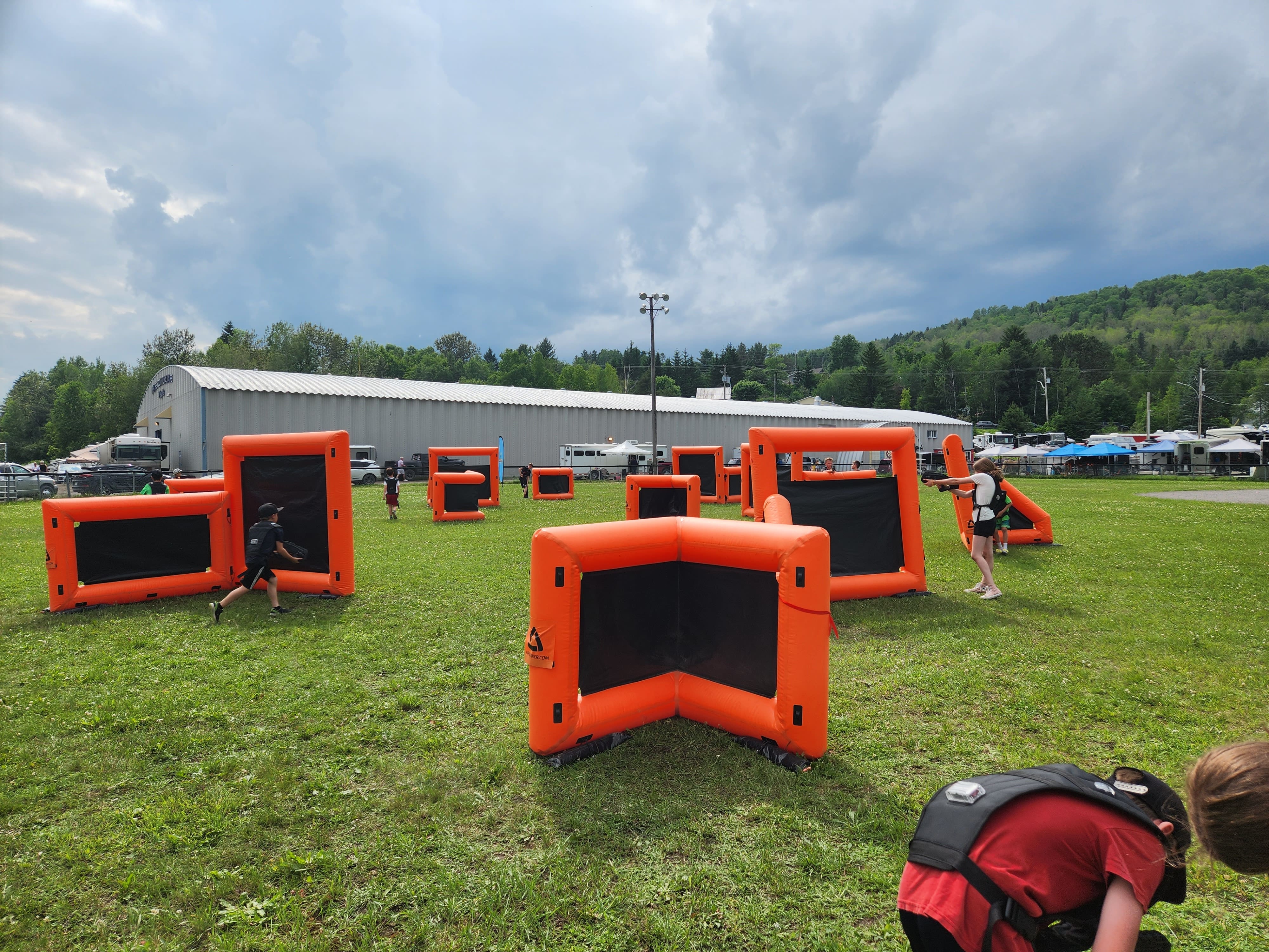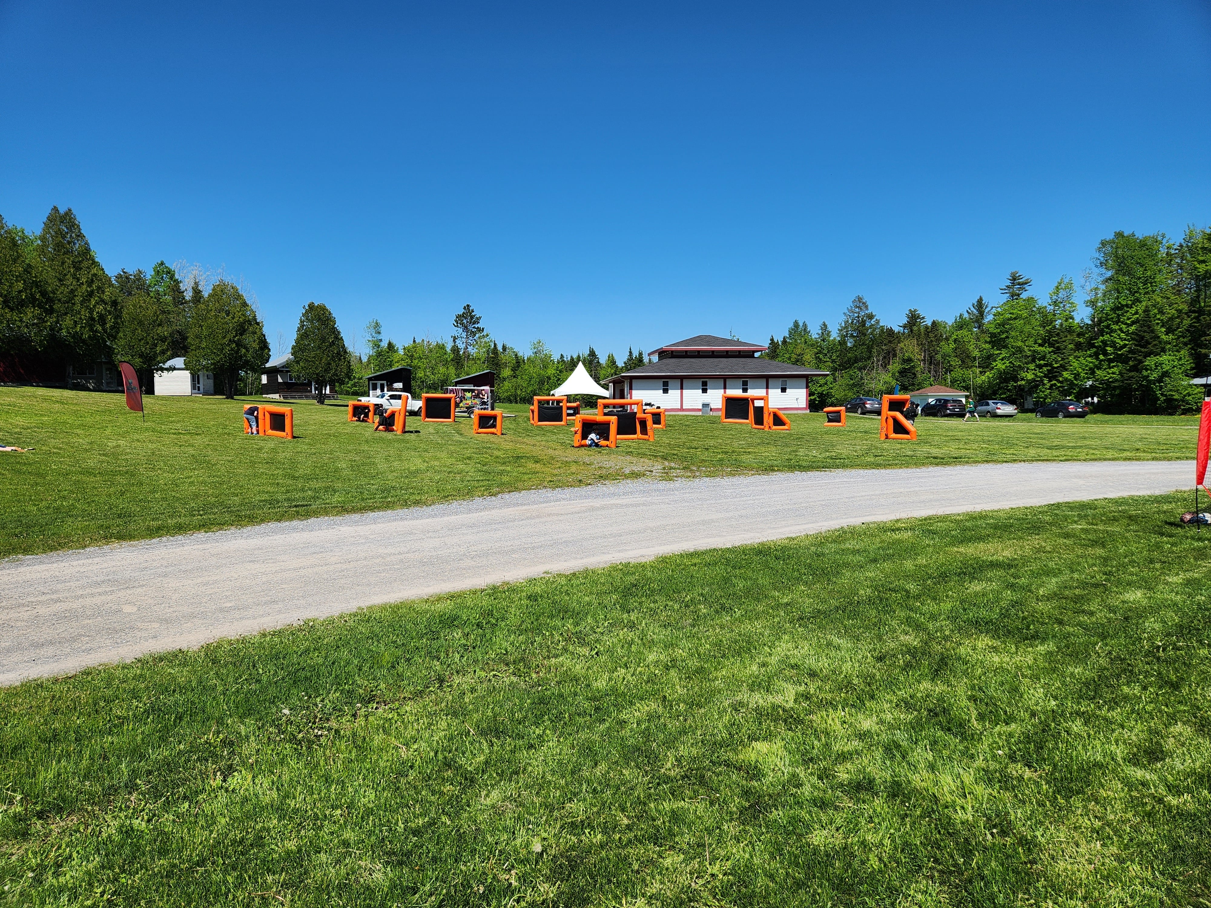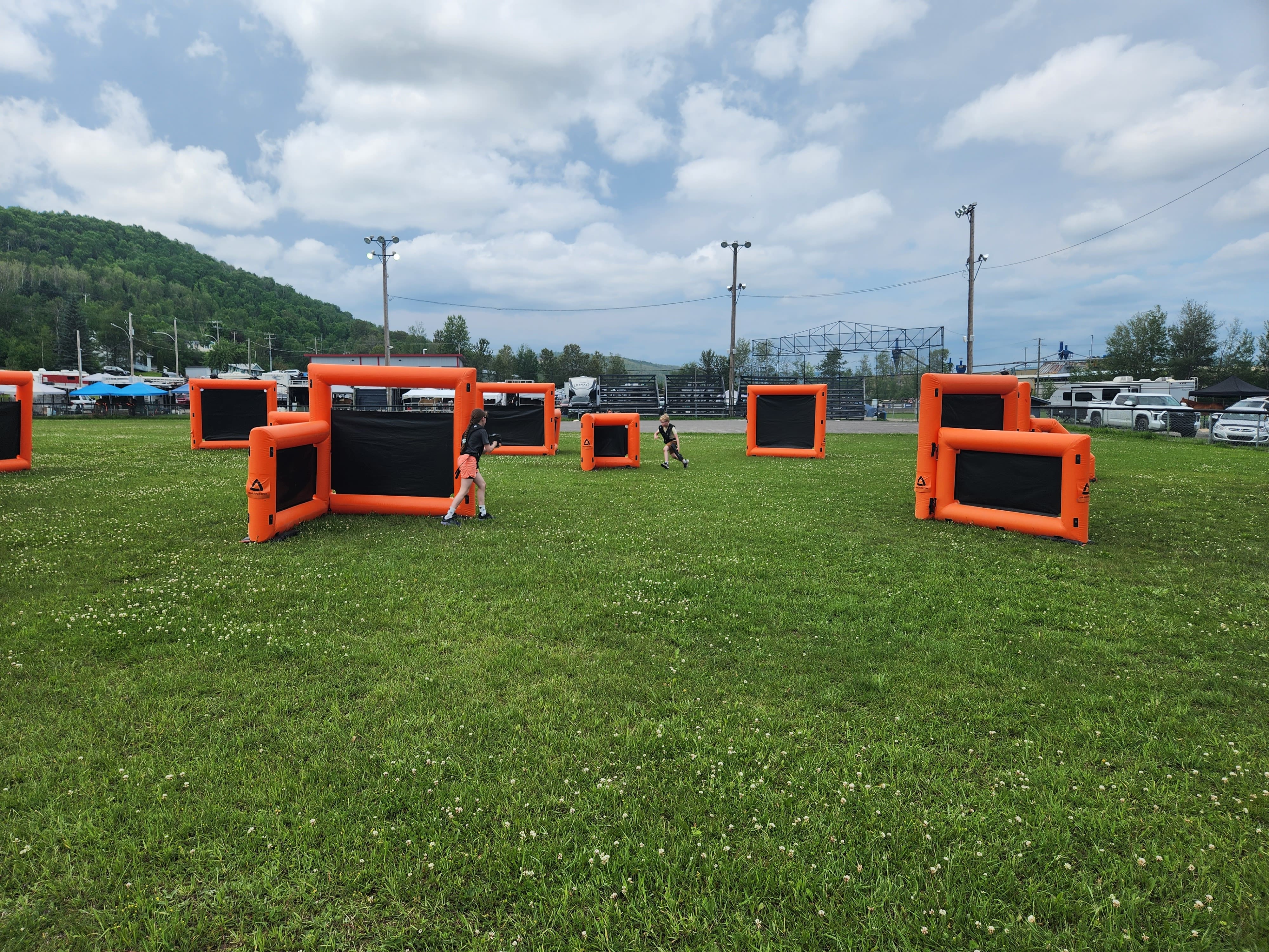 Nous arrivons sur place entre 1h30 et 2h avant le début de l'activité pour installer notre parcours de murs gonflables.