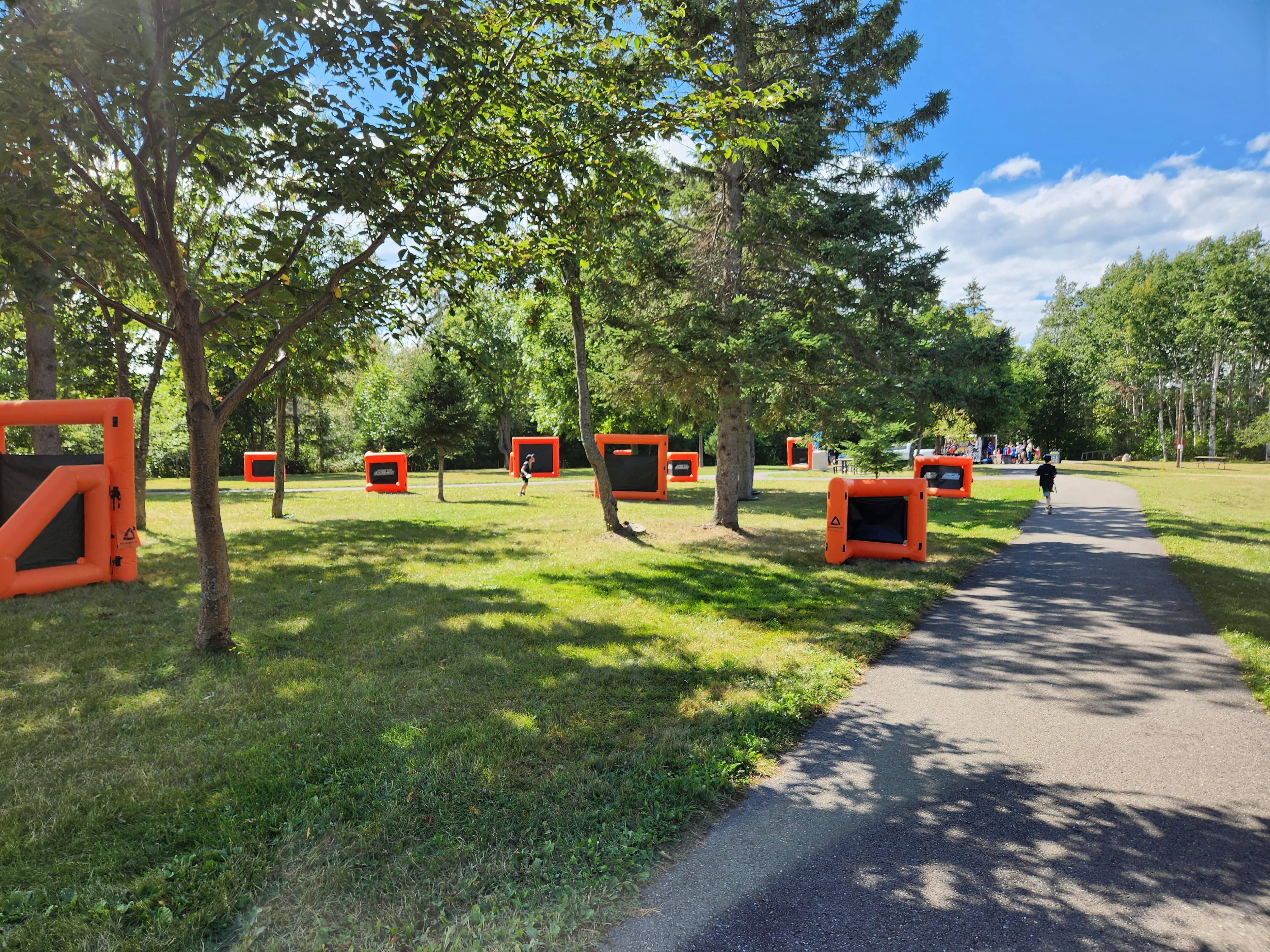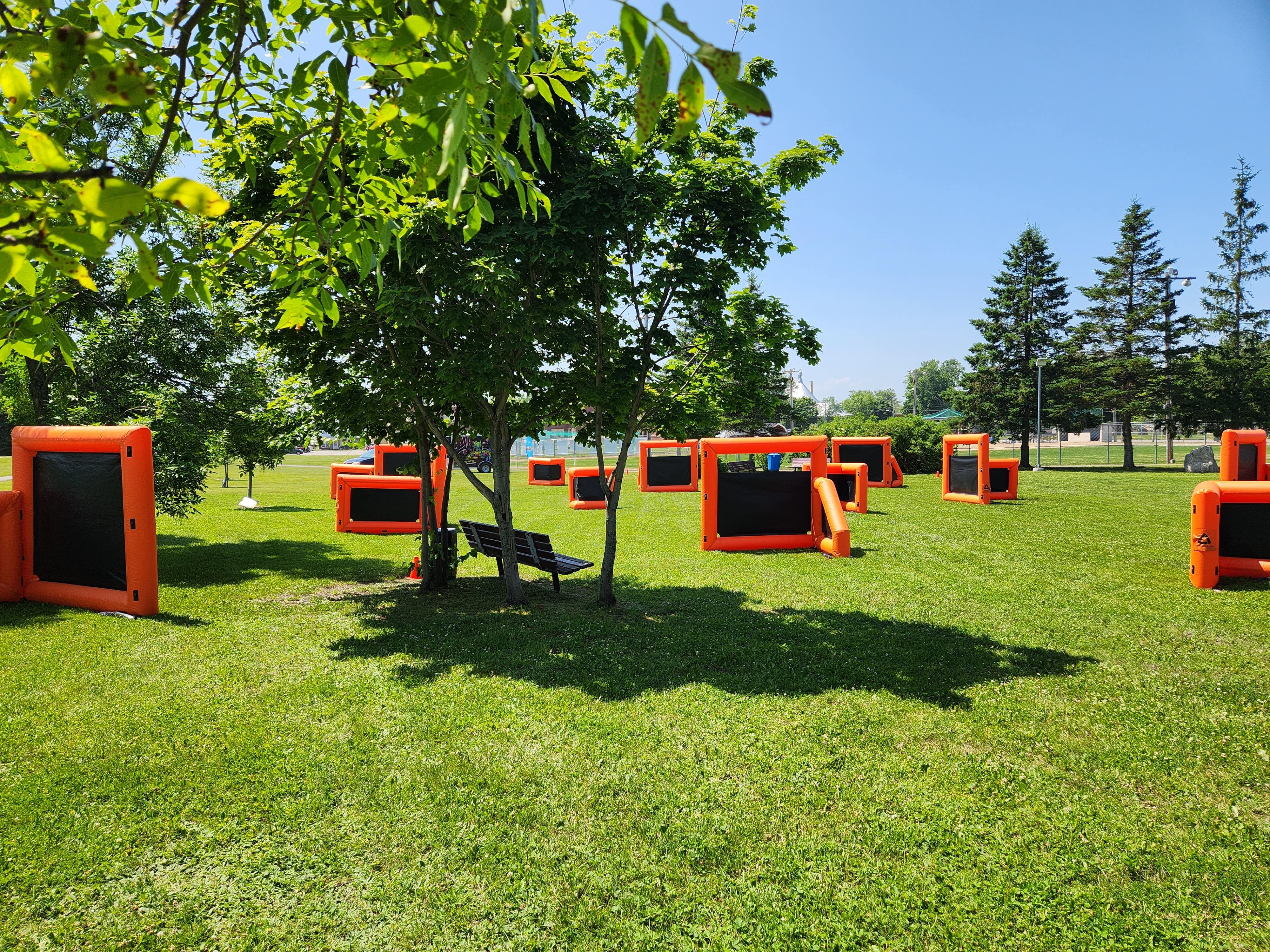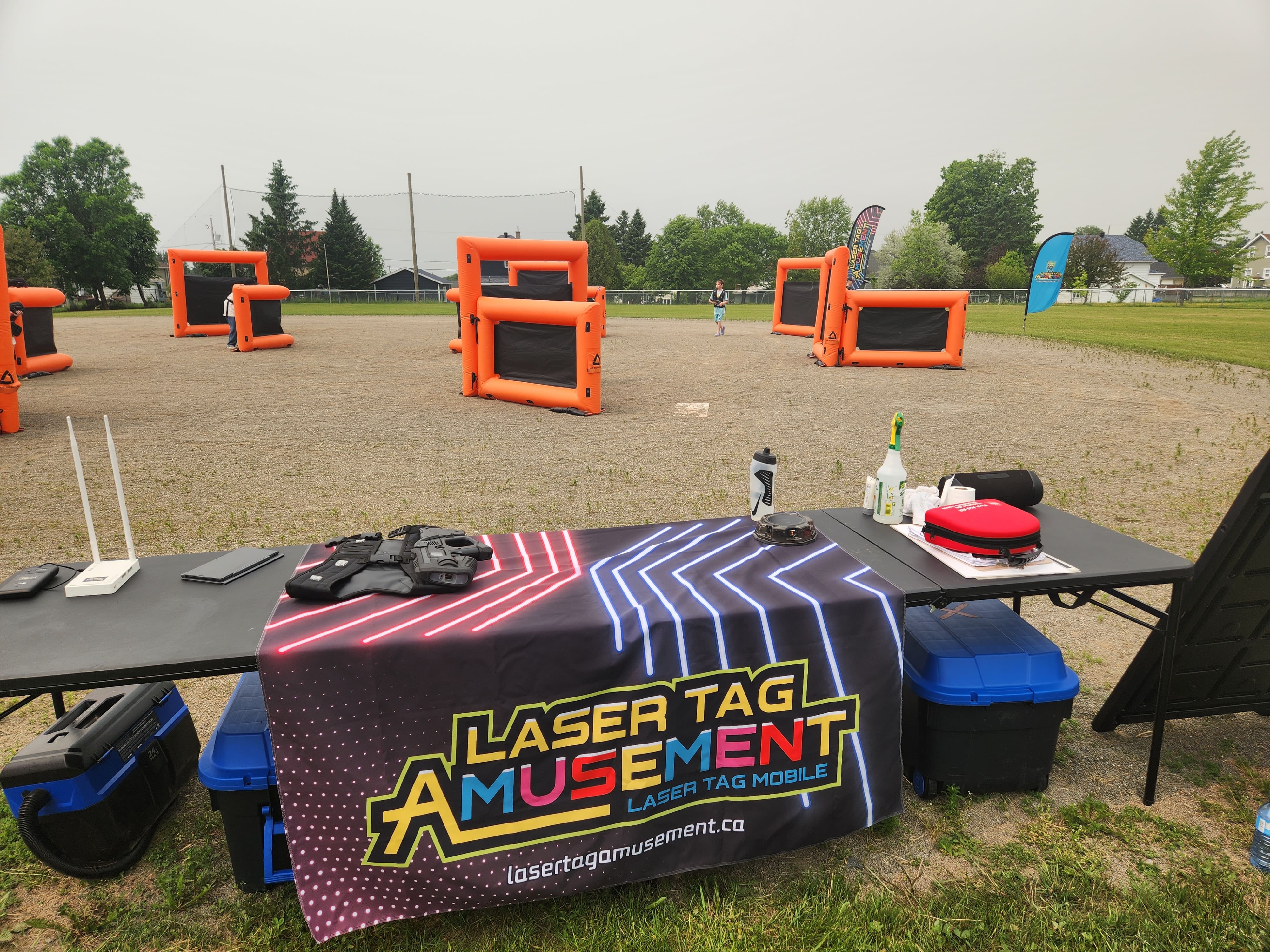 Nous arrivons sur place entre 1h30 et 2h avant le début de l'activité pour installer notre parcours de murs gonflables.