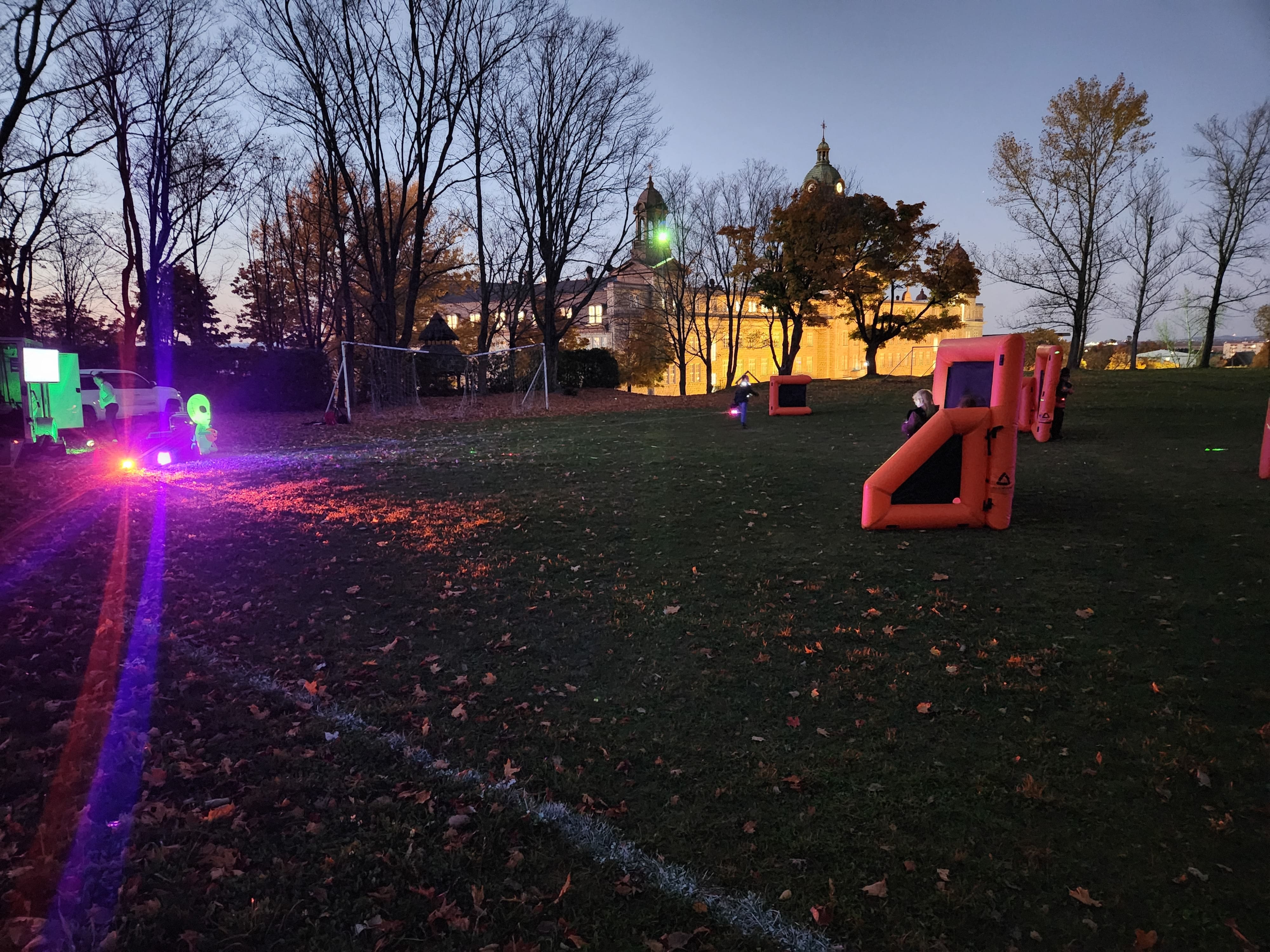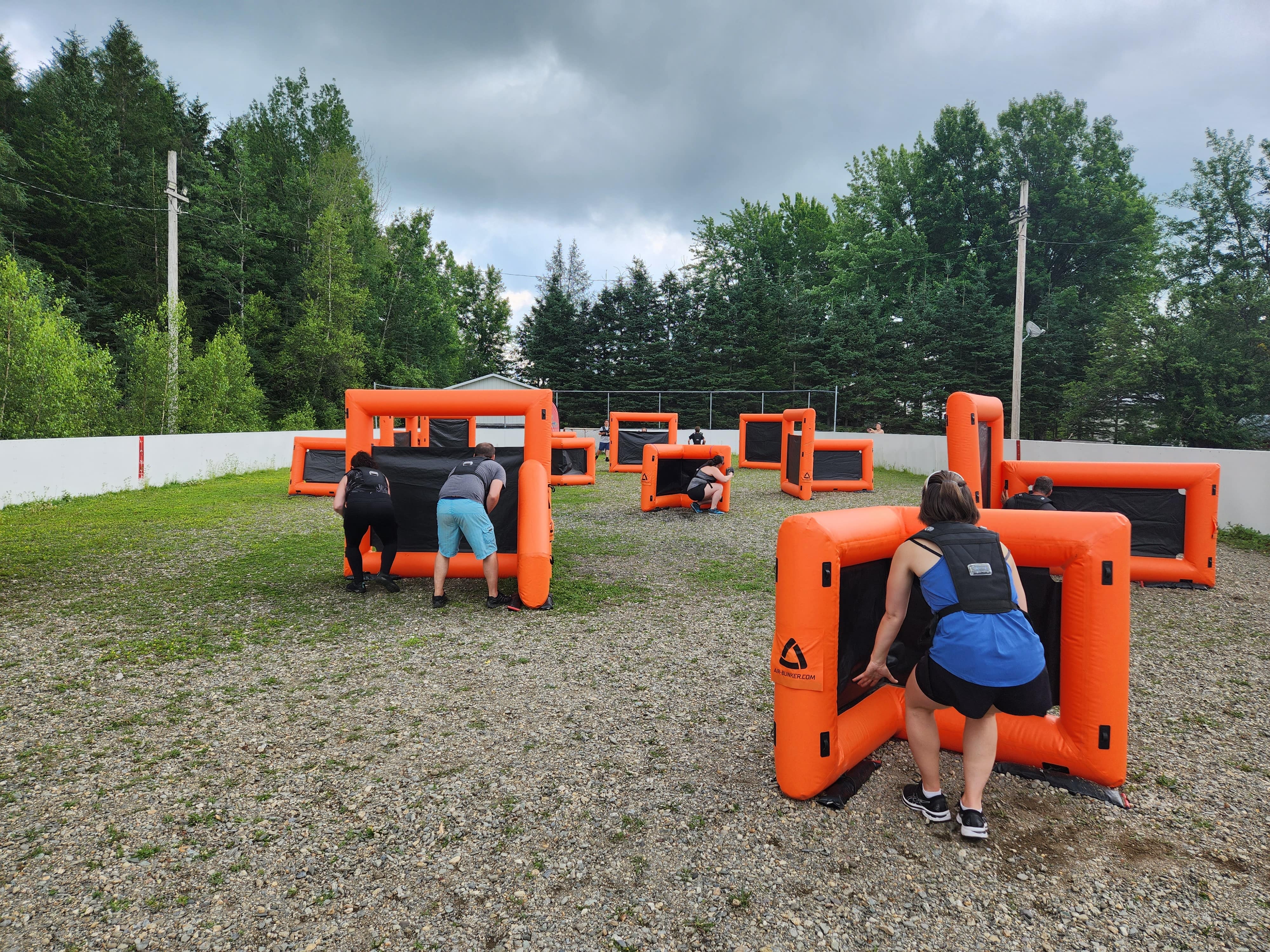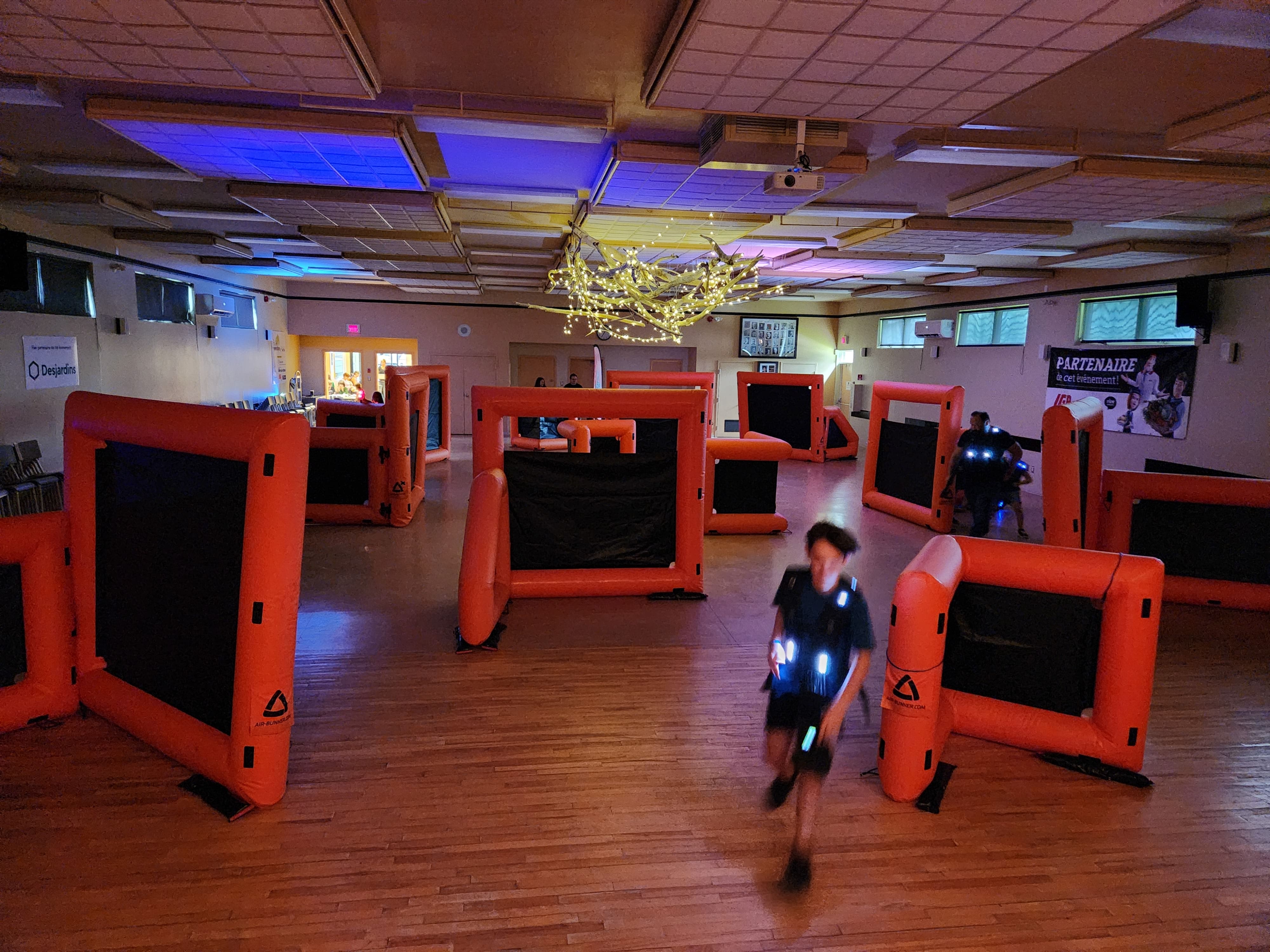Si l'activité se déroule à l'extérieur, un terrain de soccer d'une école primaire peut suffire, mais la zone peut être plus vaste, comme un parc municipal ou un plus grand terrain. Si l'activité se déroule à l'intérieur dans le cas du laser tag, nous recommandons généralement une superficie de 2500 pi², bien que la zone puisse être plus petite, ce qui pourrait limiter les mouvements. Nous évitons les stationnements et tout terrain asphalté afin de limiter les risques de blessures aux genoux et aux bras.